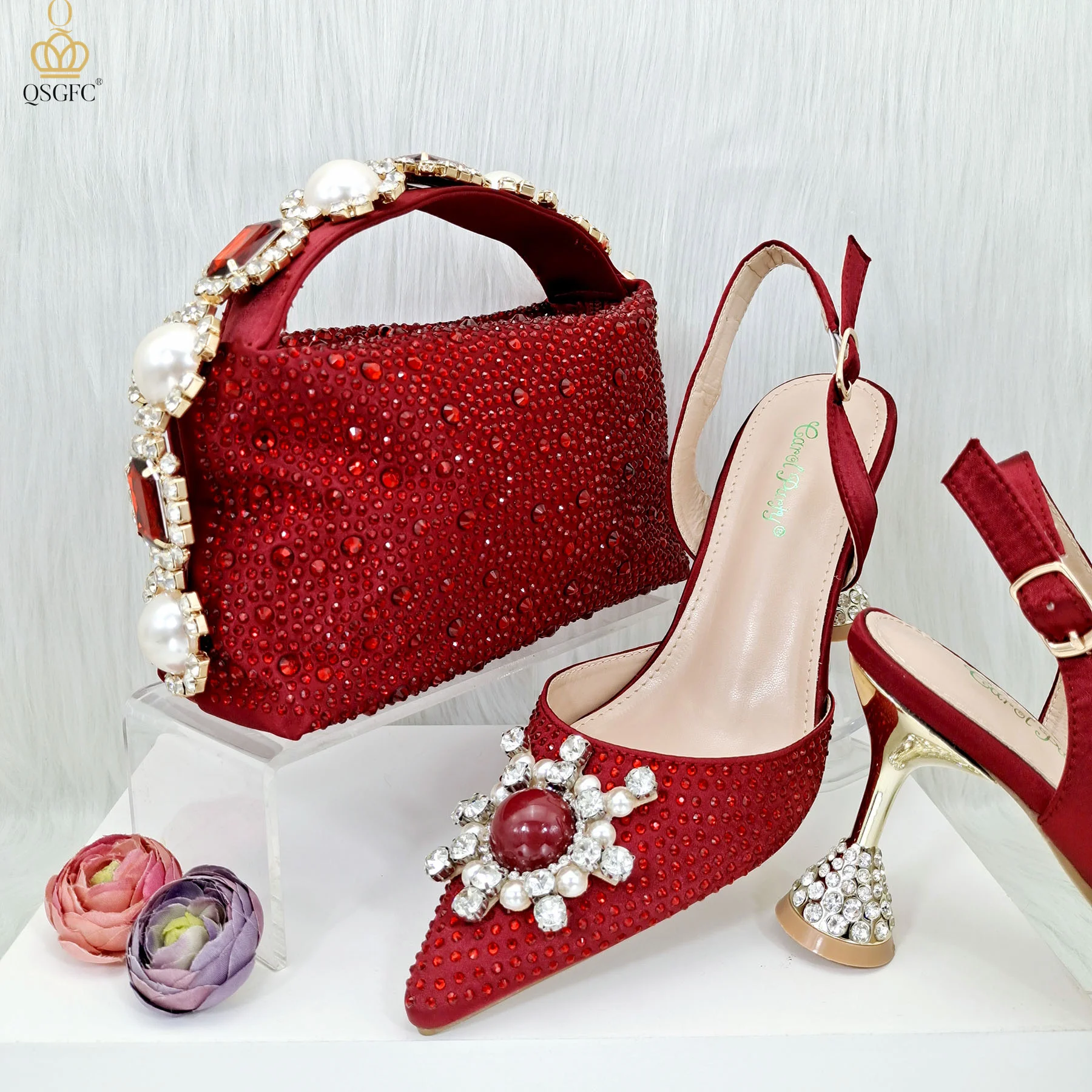 QSGDavid-Ensemble de sac à main décoratif pour femme, talons hauts, diamant en métal, qualité SSS, bordeaux, luxe, banquet, chaussures, mode, 2023