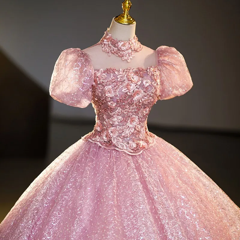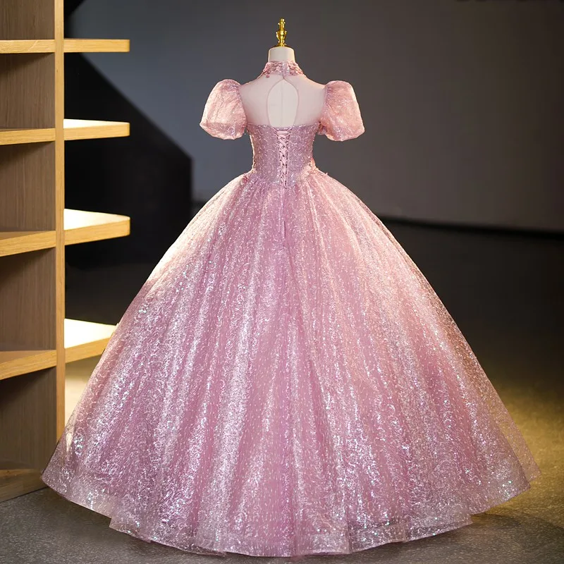 Robe de soirée de luxe rose à col haut, manches bouffantes, robe de bal classique à paillettes, à personnaliser